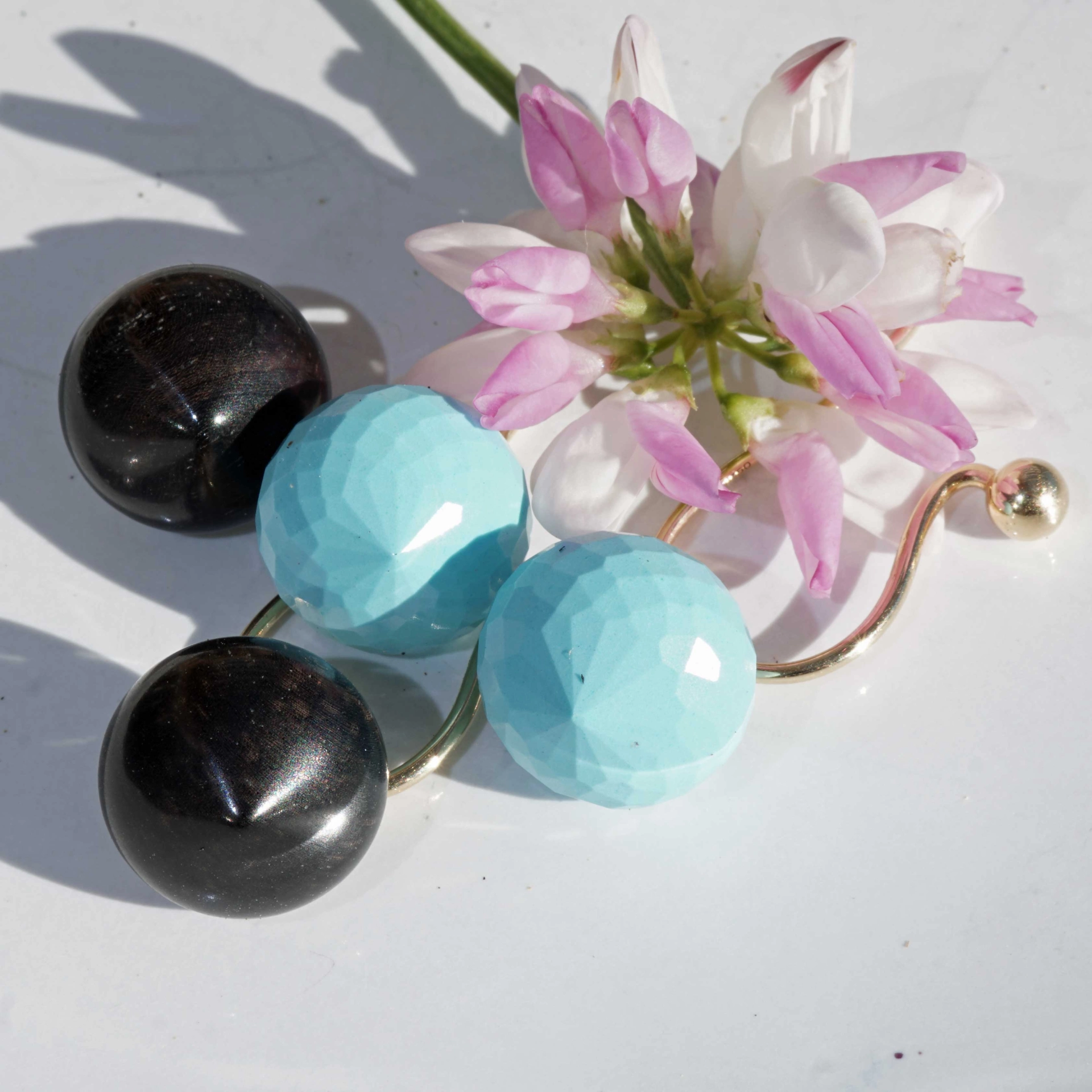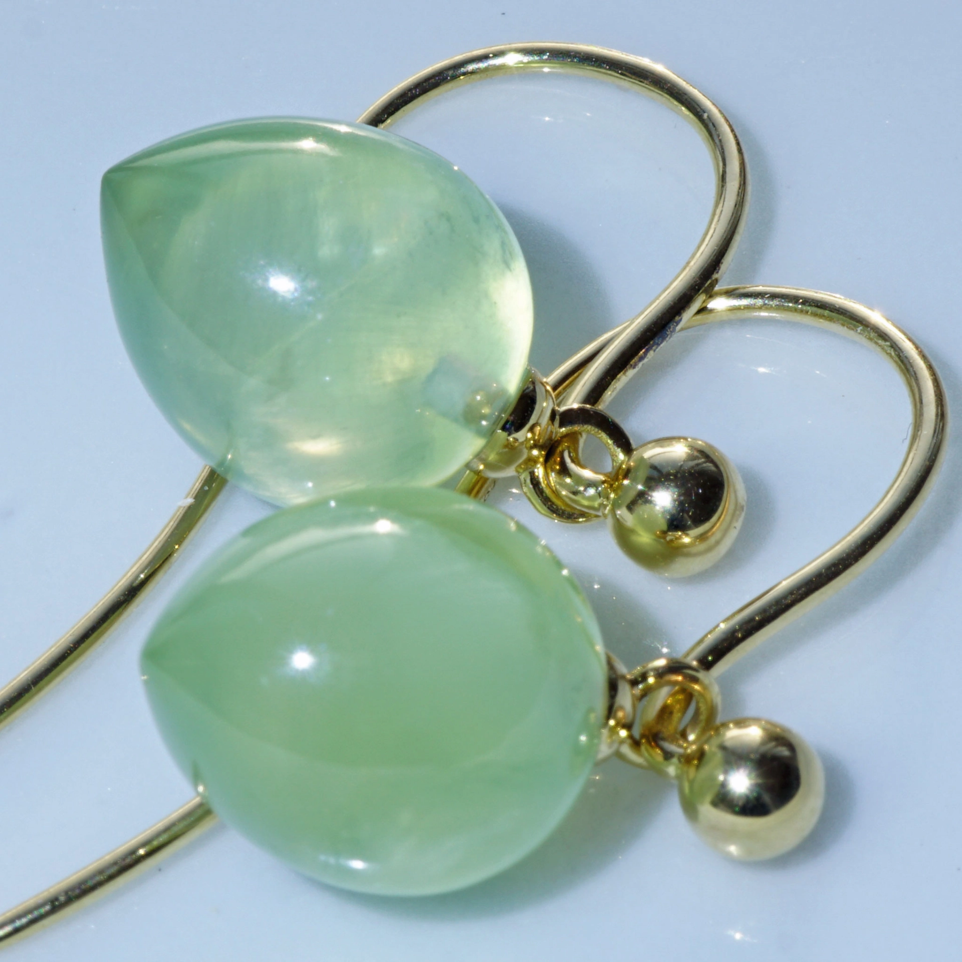 ....tolle Wechsel Ohrhänger mit facettierten Türkisen (rekonstruiert) und polierten Edelholz in Zwiebelform, als gleichfarbiges Pärchen oder in unterschiedlichen Farben kombinierbar, ca. 10 x 13 mm, eingehängt in speziell gebogenen Hakenohrhängern mit Goldperlchen als Stopp in 750er Gelbgold, 4 mm breites Perlchen, 30 mm Länge, und der Hit in ganz vielen Farben erhältliche Einhänger (bitte anfragen, abgebildet Prehnit in grün bereits verkauft), total ca. 10,50 Gramm schwer, Neuanfertigung!
